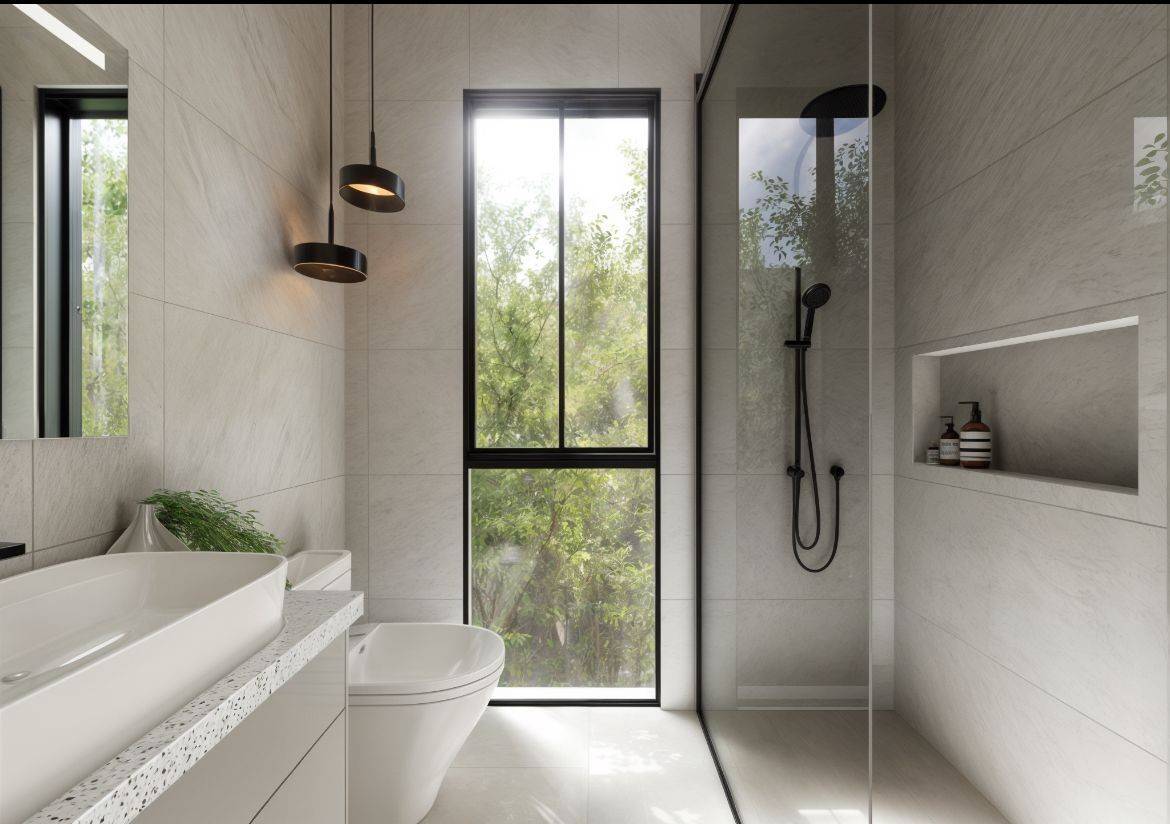 • Paredes del baño de visitas con estuco resistente a la humedad